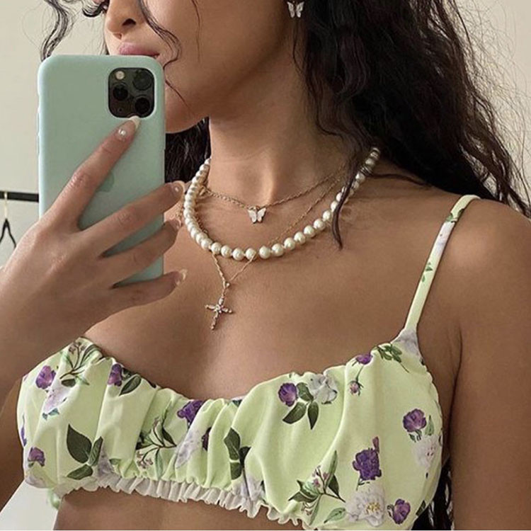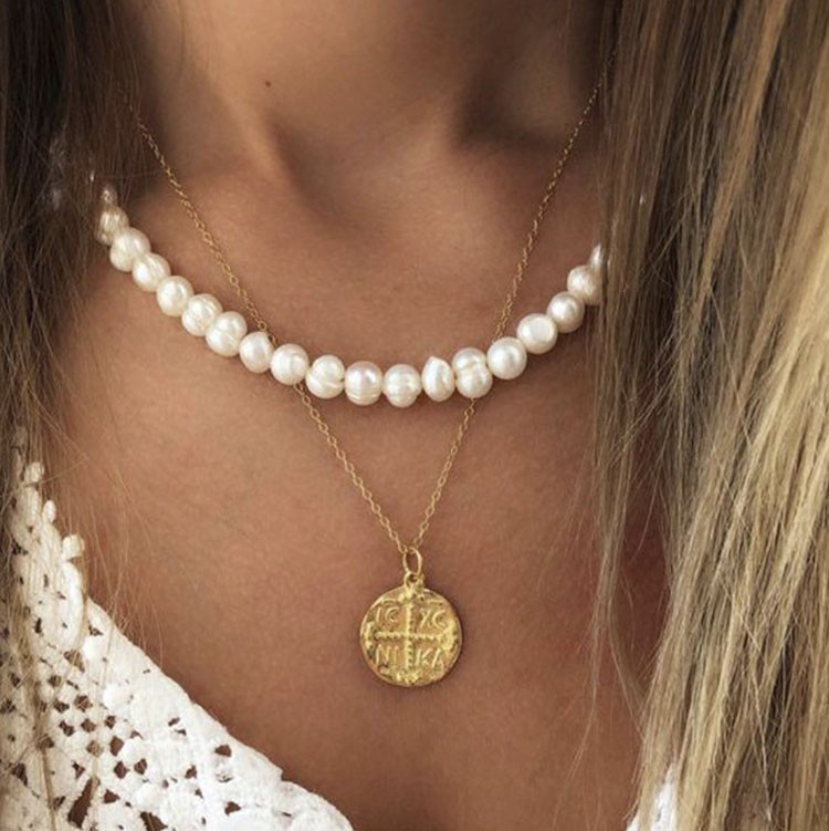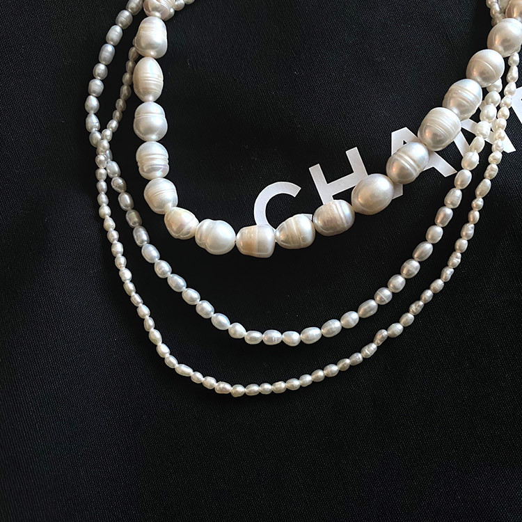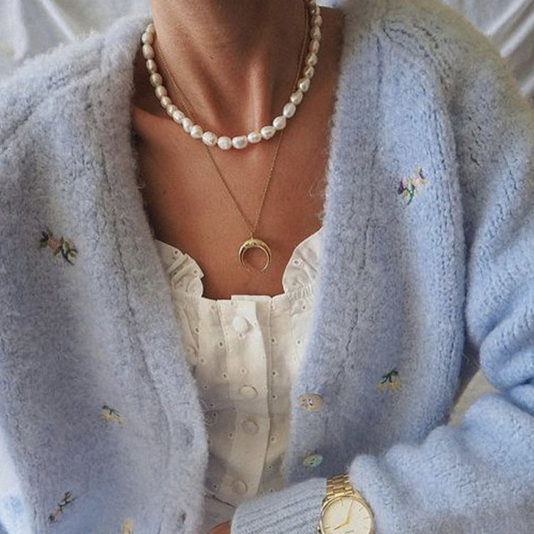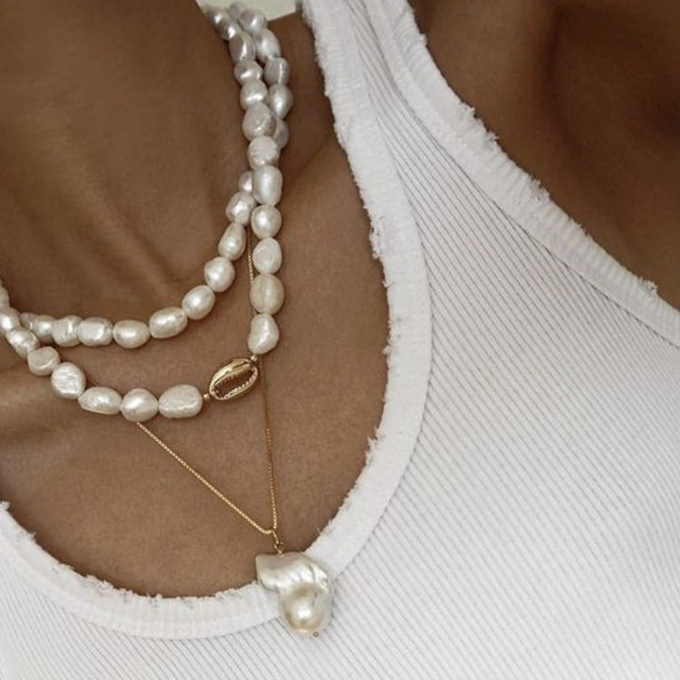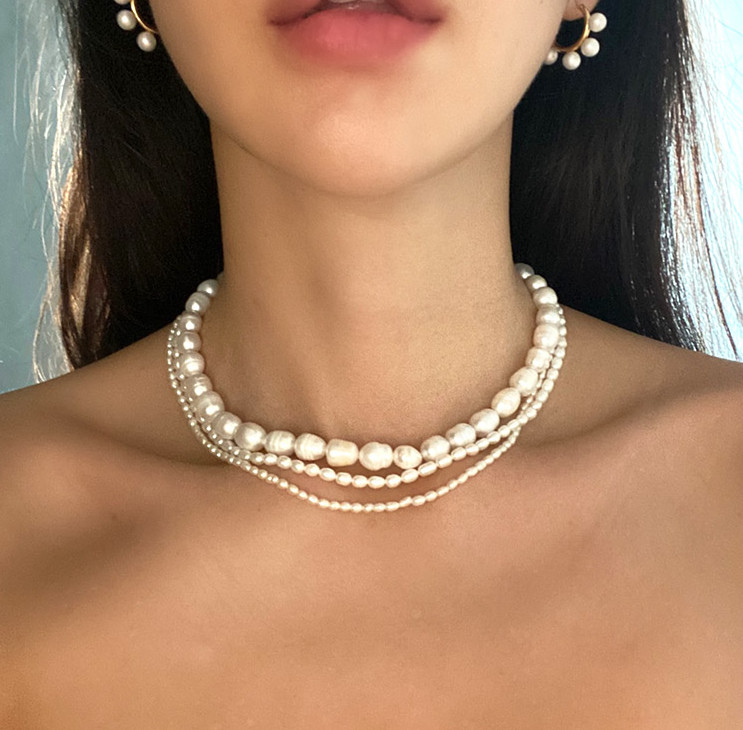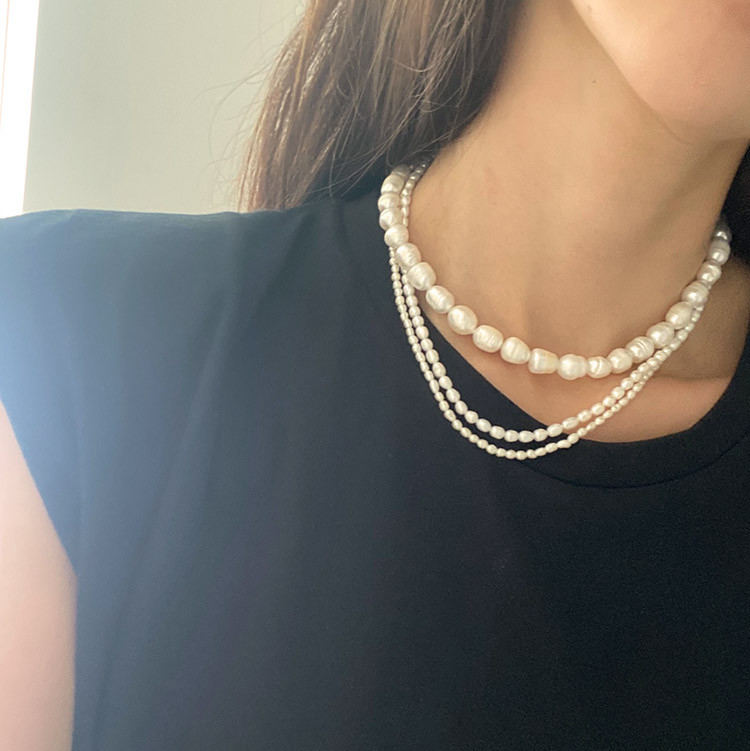 캐쥬얼한 룩에도 진주목걸이를 레이어드해서