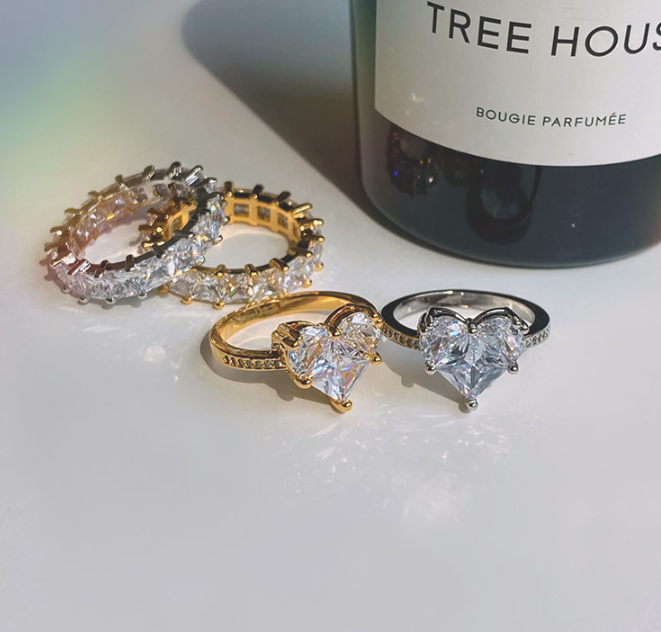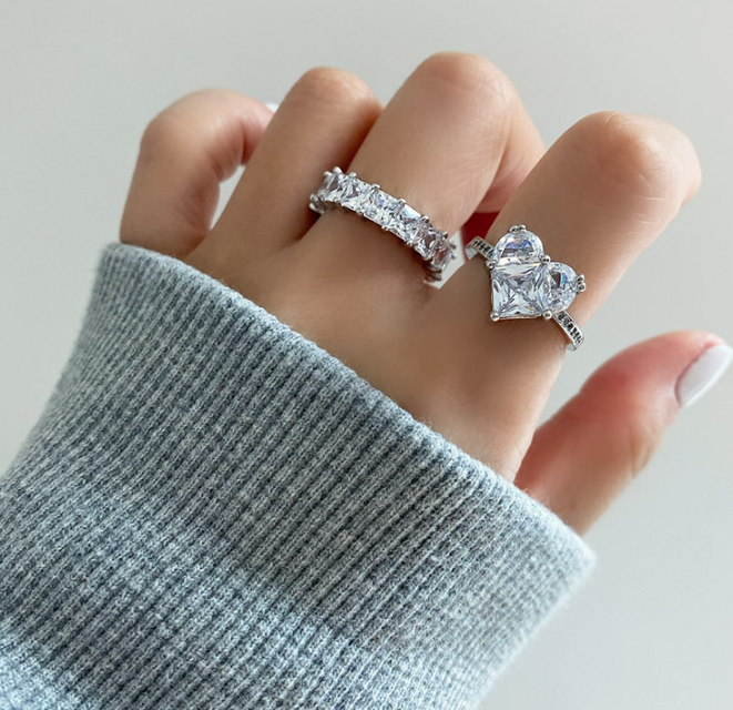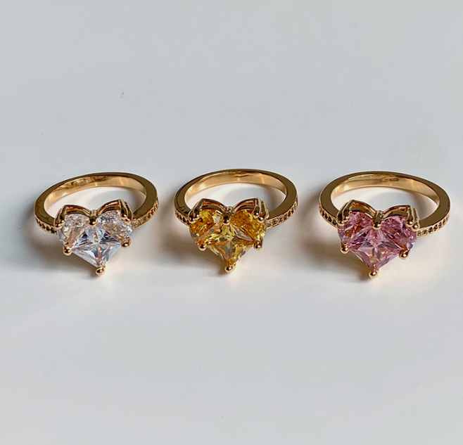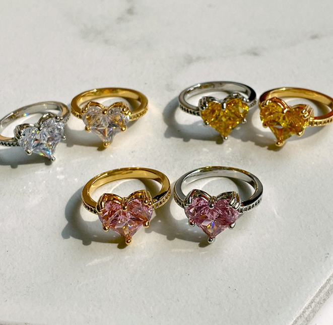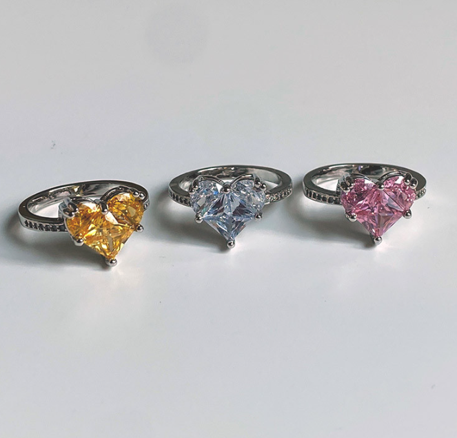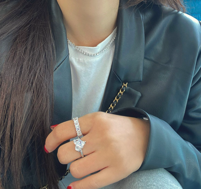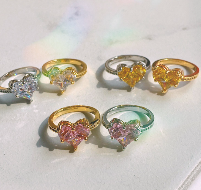 글래머러스한 하트 큐빅이 매력적인 링입니다. 큰 사이즈의 하트 큐빅에 링 앞쪽 면에는 작은 큐빅들이 촘촘히 배열되어 있습니다.