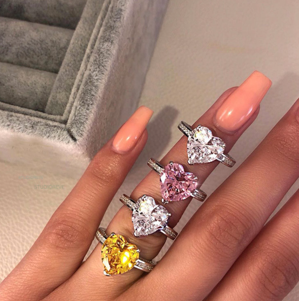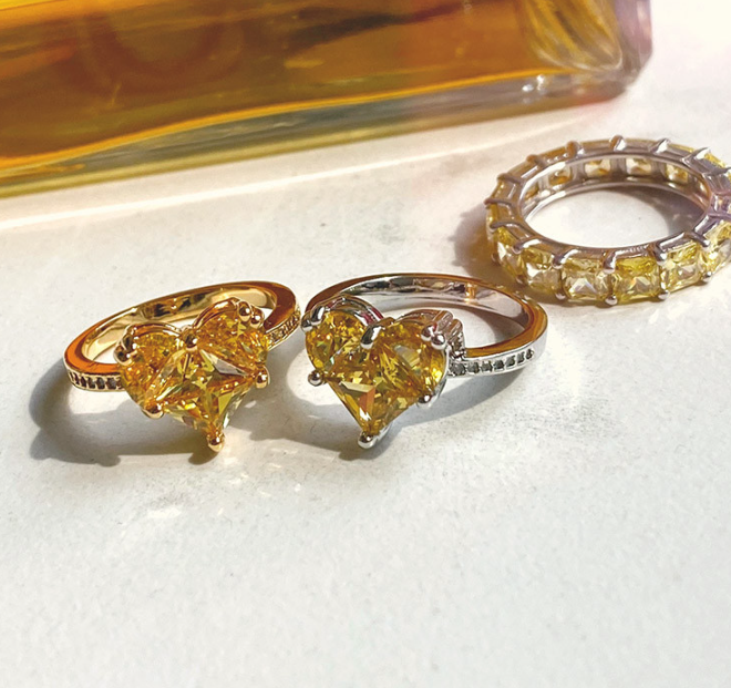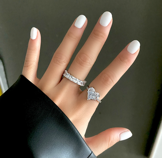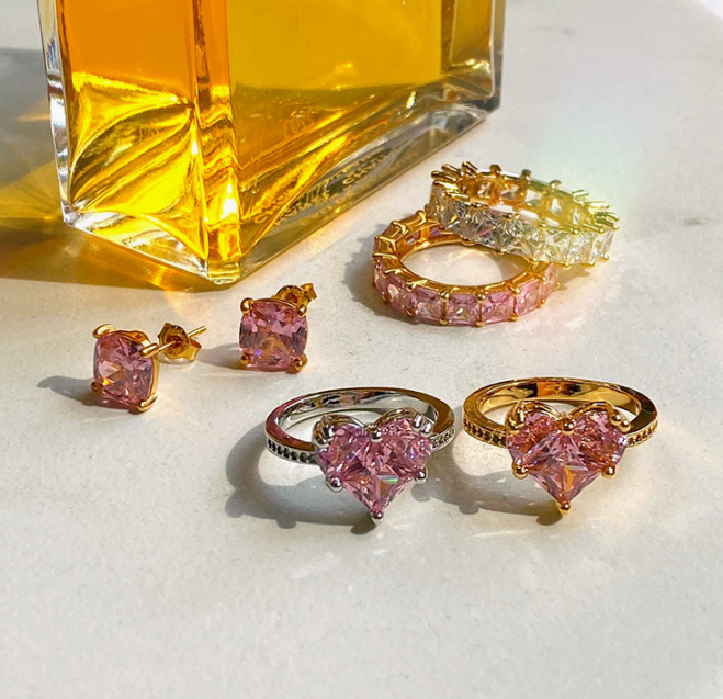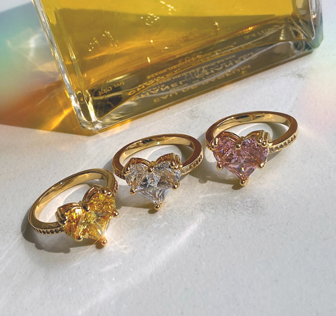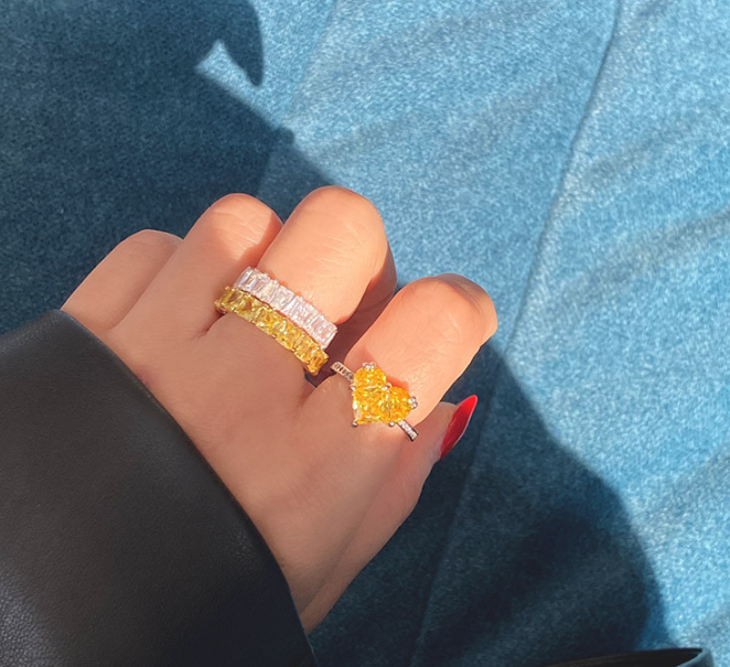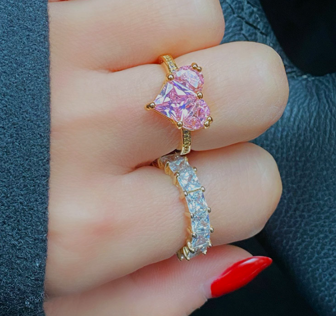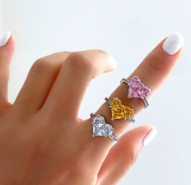 글래머러스한 하트 큐빅이 매력적인 링입니다. 큰 사이즈의 하트 큐빅에 링 앞쪽 면에는 작은 큐빅들이 촘촘히 배열되어 있습니다.
